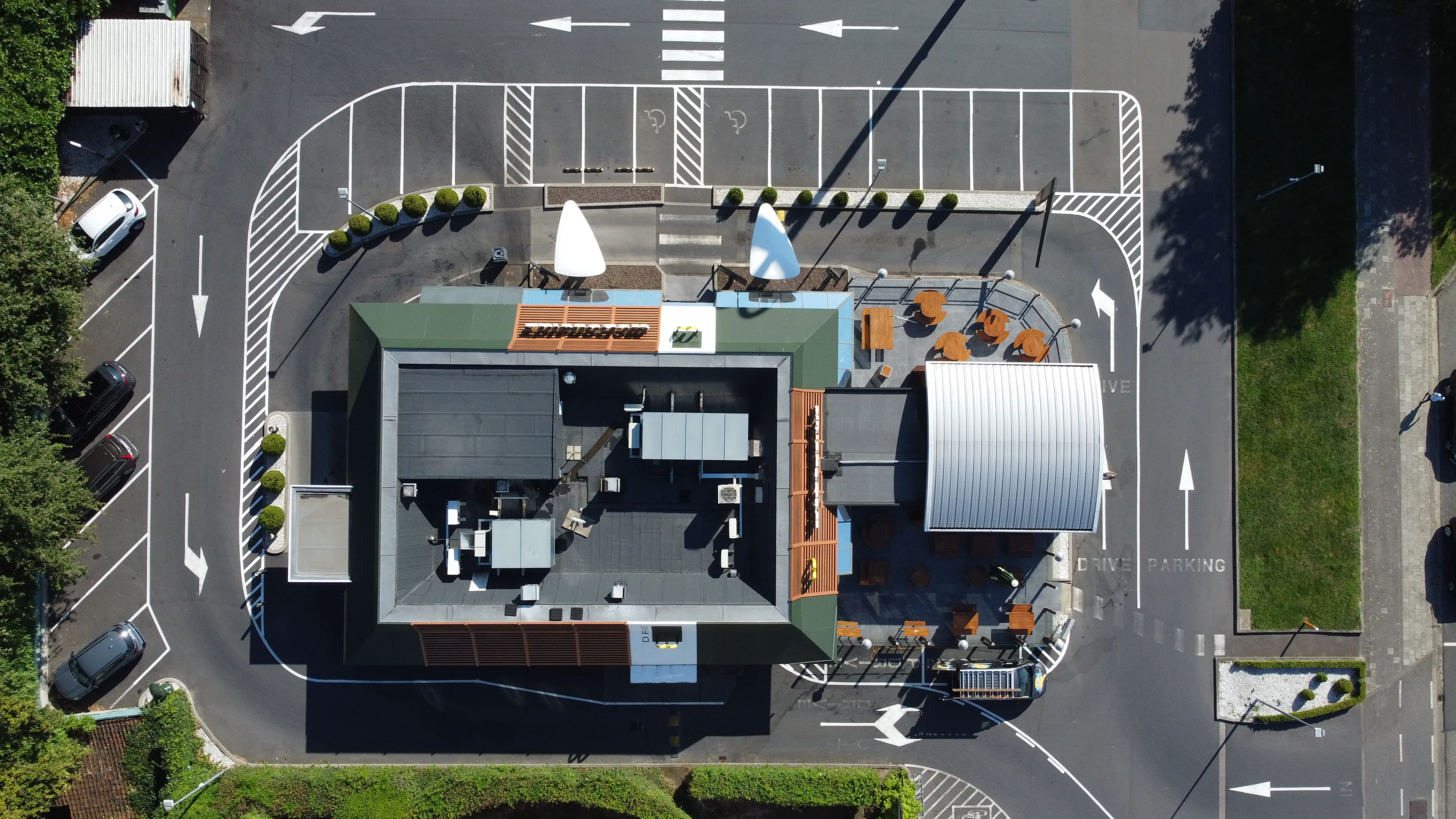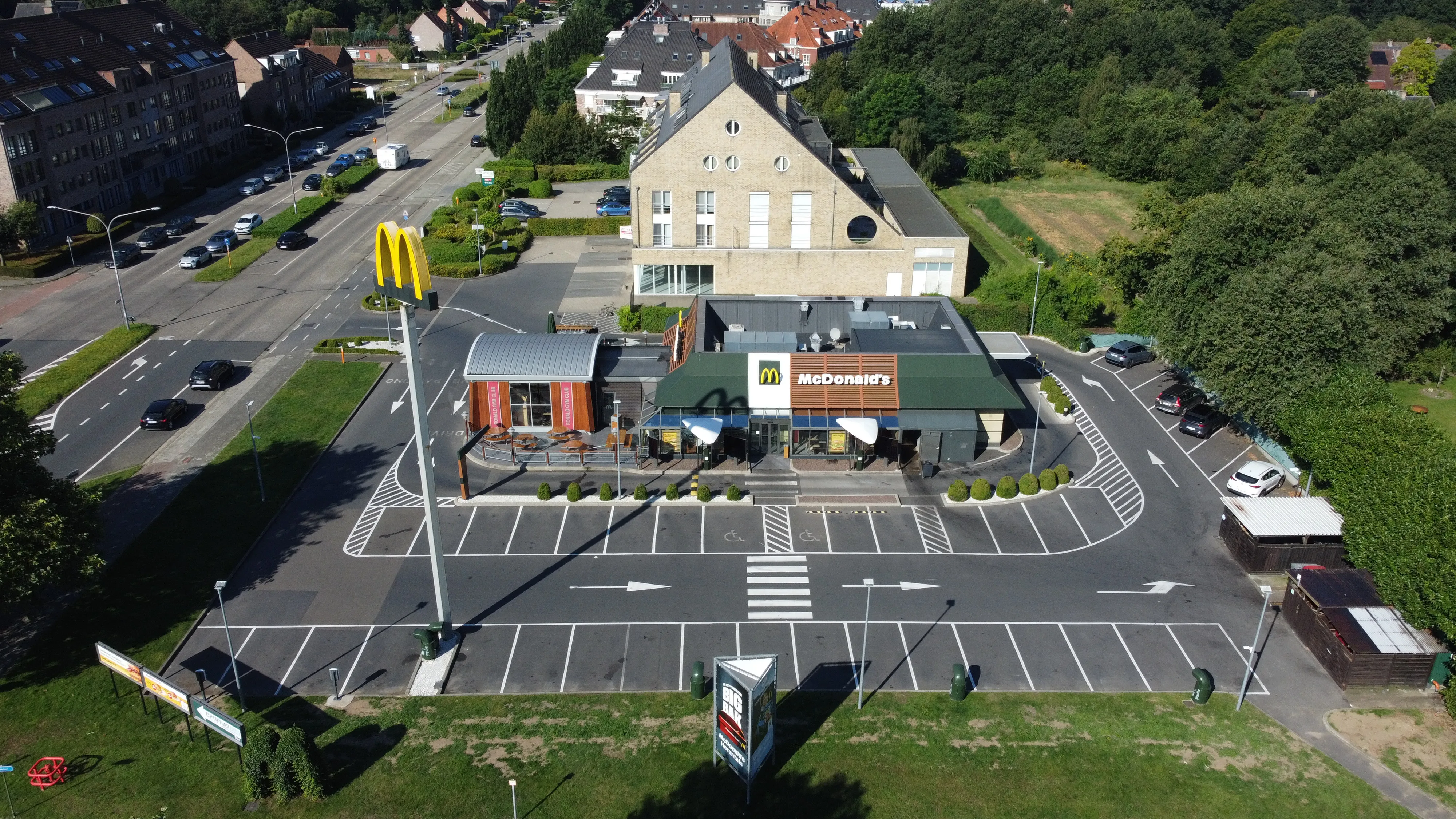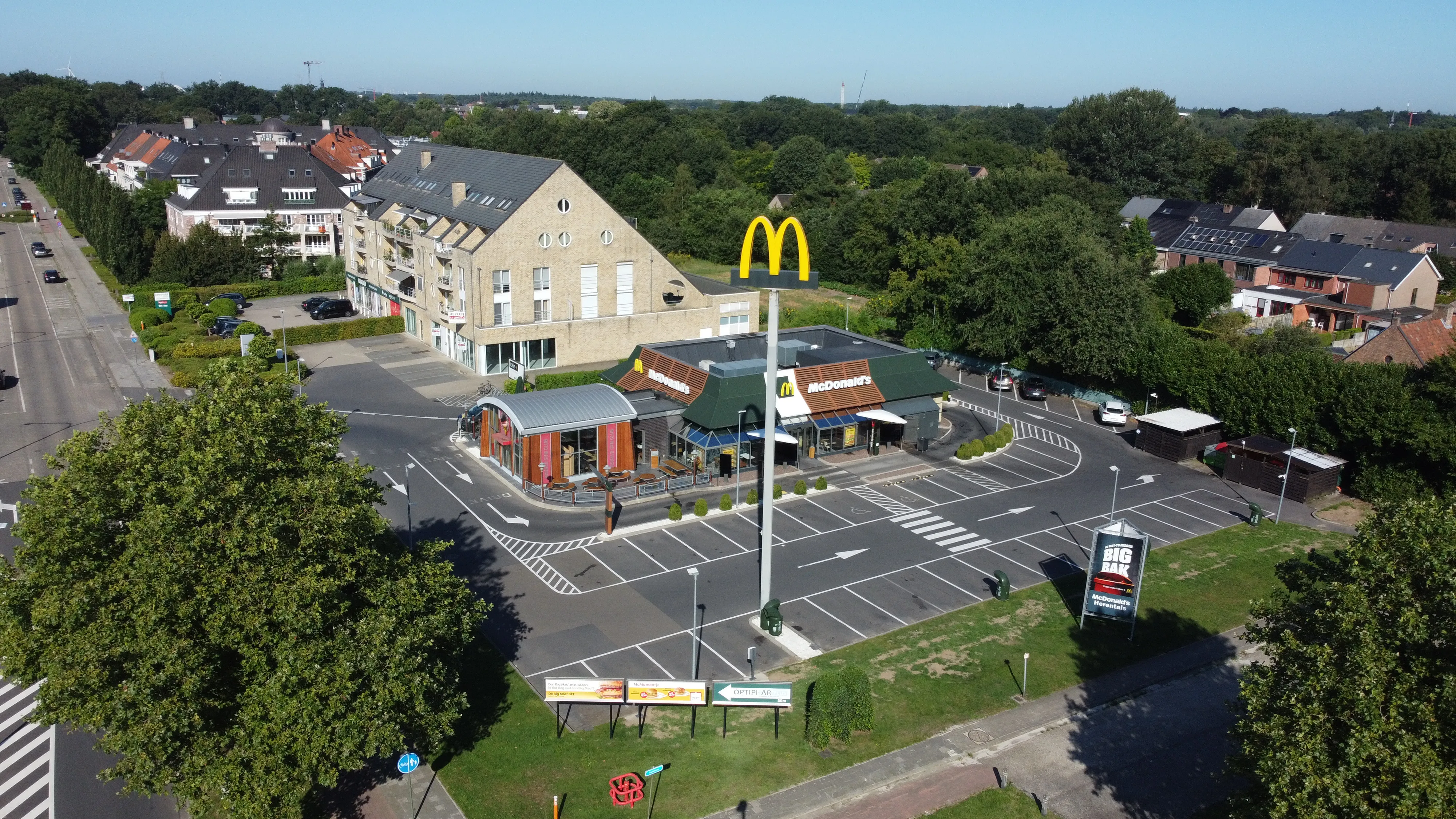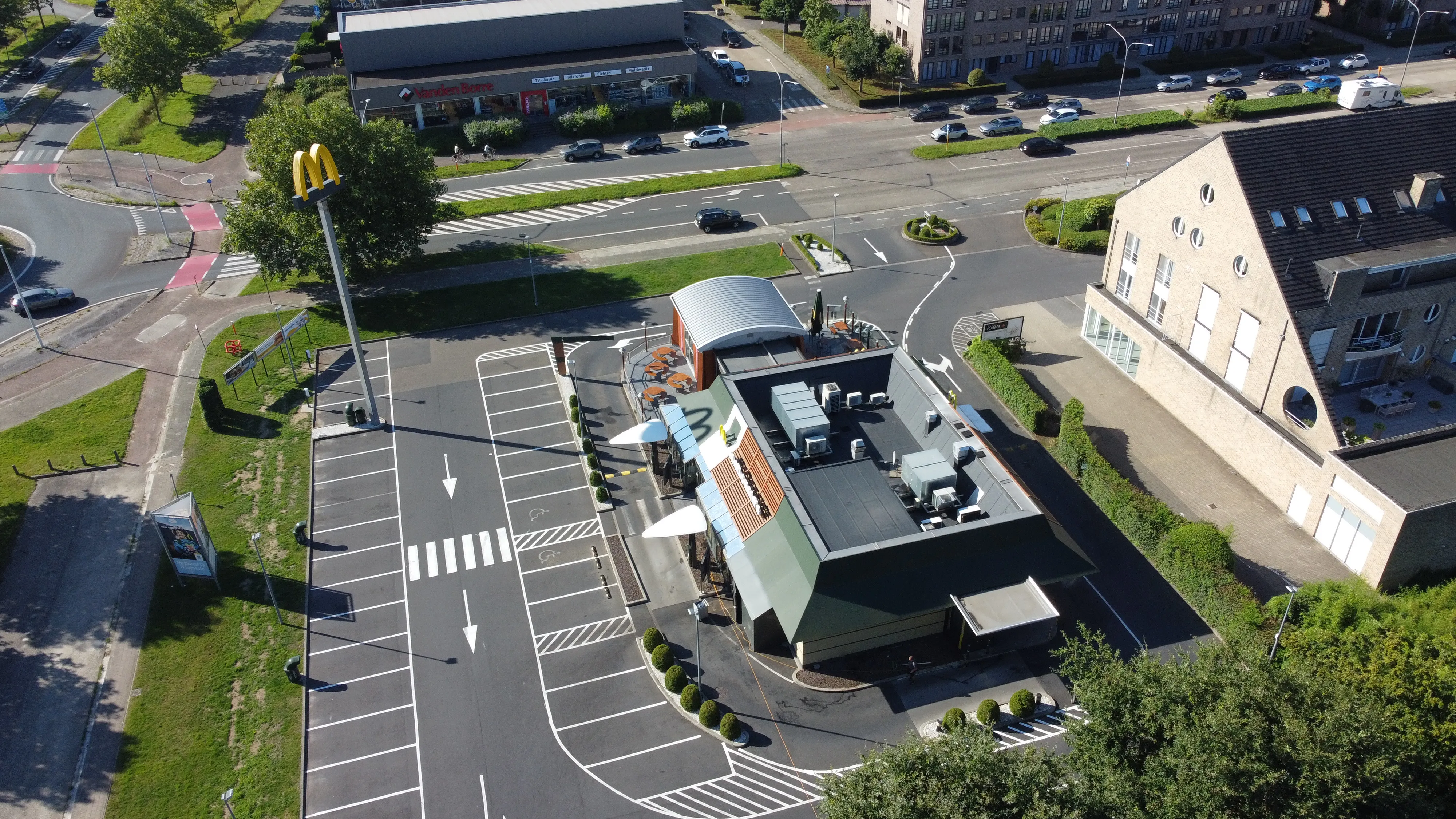 Dla restauracji McDonald’s w Herentals firma Tectum Group przeprowadziła renowację płaskich dachów o łącznej powierzchni około 500 m². Istniejąca konstrukcja dachu została odnowiona i wyposażona w izolację PIR w połączeniu z dwuwarstwową bitumiczną hydroizolacją. Dzięki temu budynek jest ponownie trwale chroniony przed warunkami atmosferycznymi, ze szczególnym uwzględnieniem właściwości termicznych i niezawodności działania.
